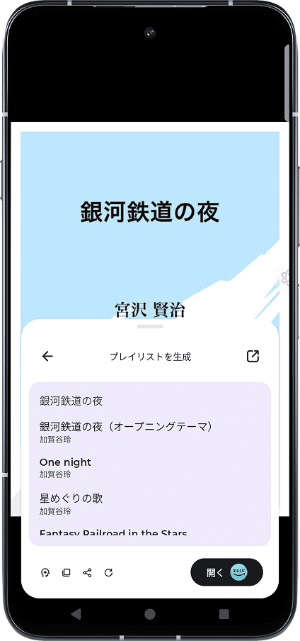 これから読む書籍の表紙を画面に表示した状態でarrows AIを起動すると、その本の世界観に合った音楽プレイリストがかんたんに生成できます。
