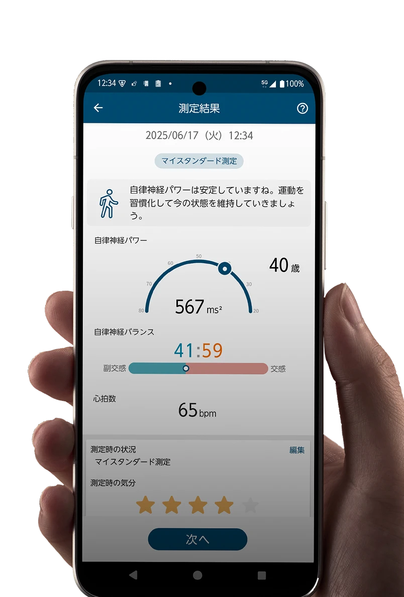 指先から読み取ったバイタルデータをもとに、自律神経の状態を解析。心と身体の健康状態を可視化します。